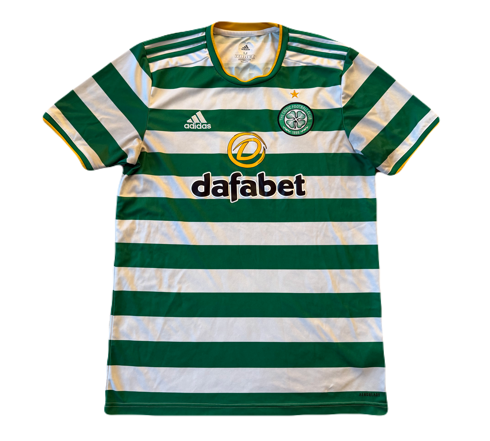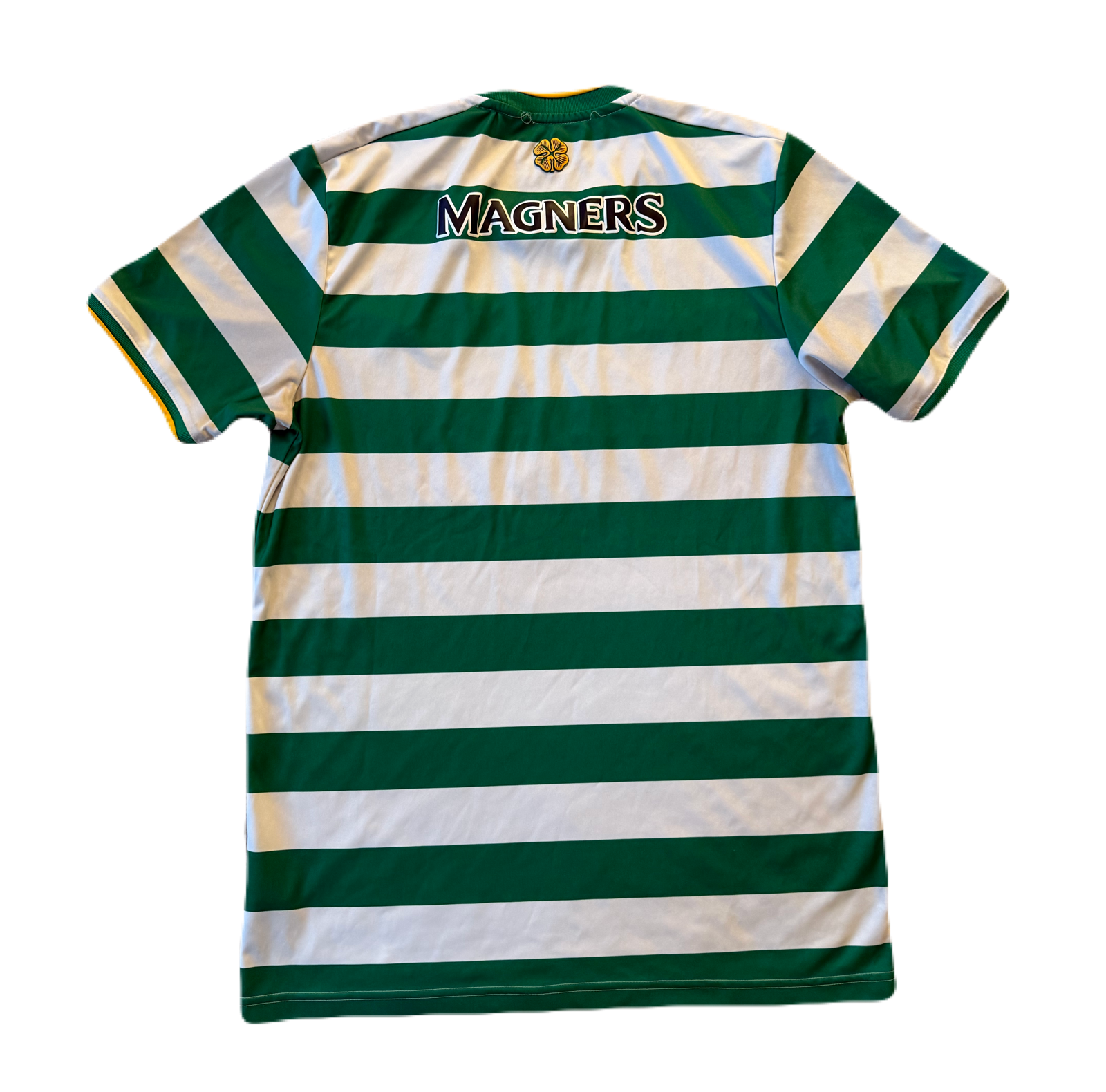 Condition Details: The sponsor on the front and back are slightly worn and cracking. An overall faded look to the shirt. A snag to the right of the front sponsor